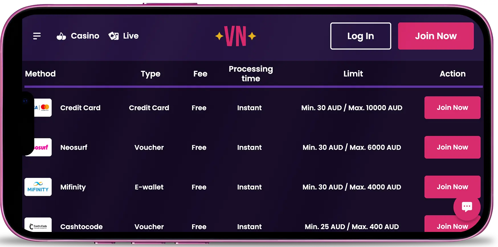 | Neosurf | Voucher | Free | Instant | Min. 30 AUD / Max. 6000 AUD |