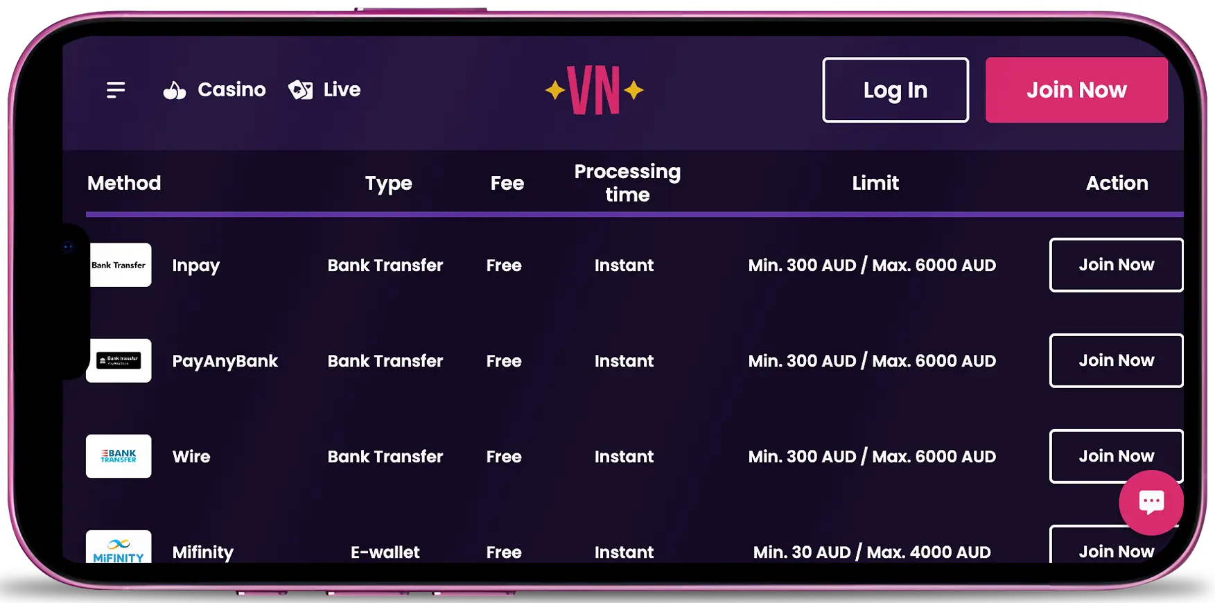 | Mifinity | E-wallet | Free | Instant | Min. 30 AUD / Max. 3500 AUD |